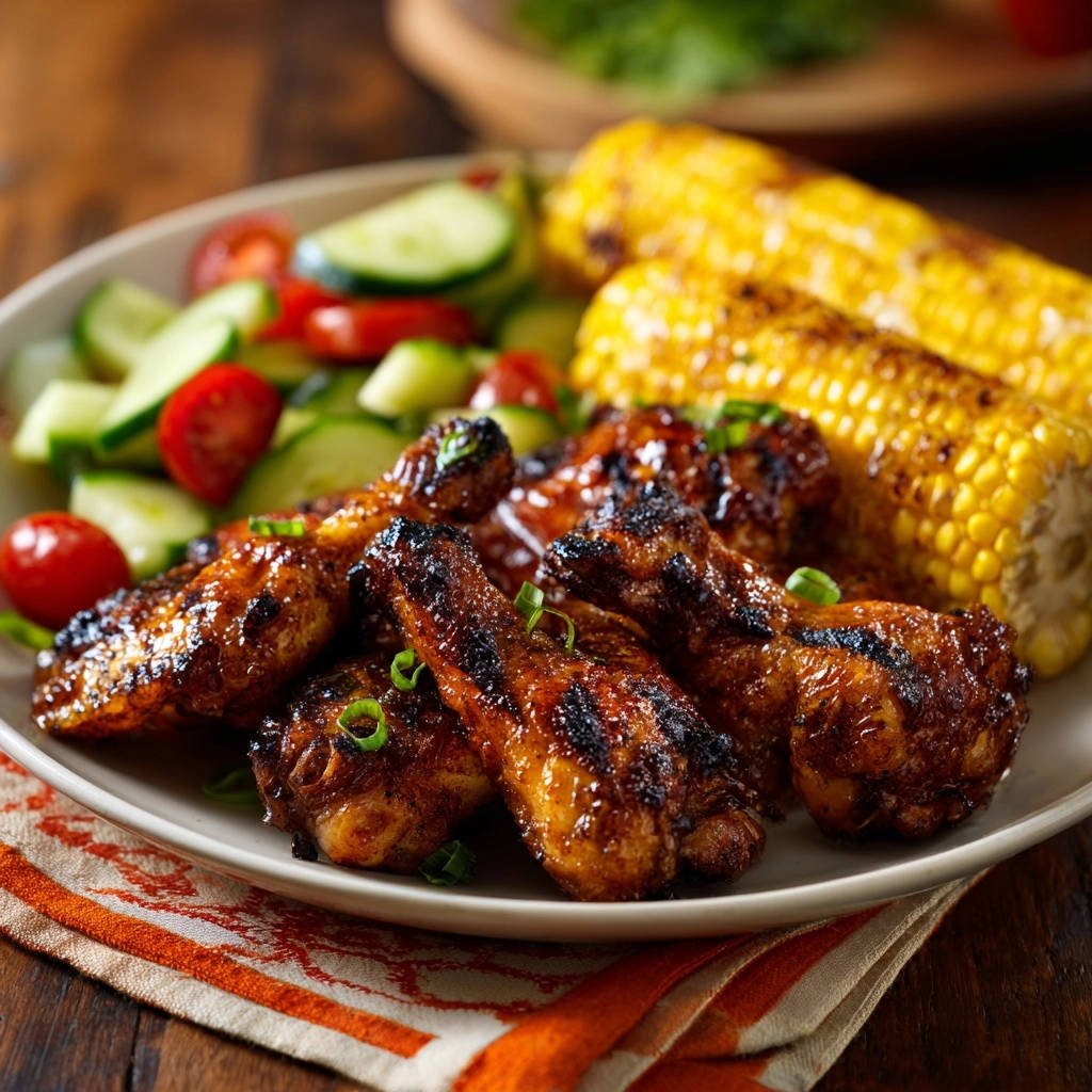 Step 10: Serve and Garnish. Arrange the juicy BBQ Glazed Drumsticks alongside the perfectly grilled corn on the cob and the fresh cucumber tomato salad. For a final flourish, garnish the chicken with thinly sliced green onions just before serving. Enjoy!