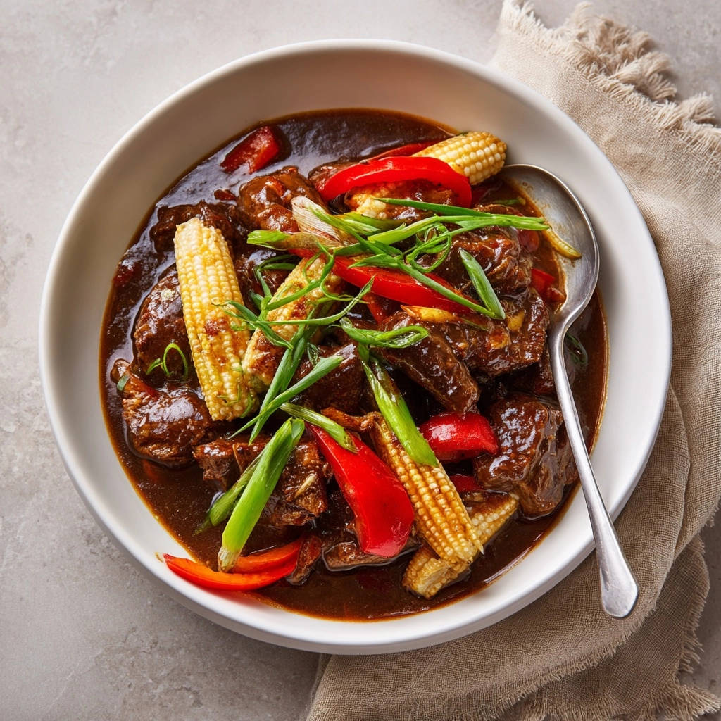 The savory-sweet braising liquid, a harmonious blend of soy sauce, beef broth, and aromatics, develops incredible depth. Fresh red bell peppers and baby corn are added at just the right time, ensuring they retain their vibrant color and a pleasant bite, balancing the richness of the sauce.