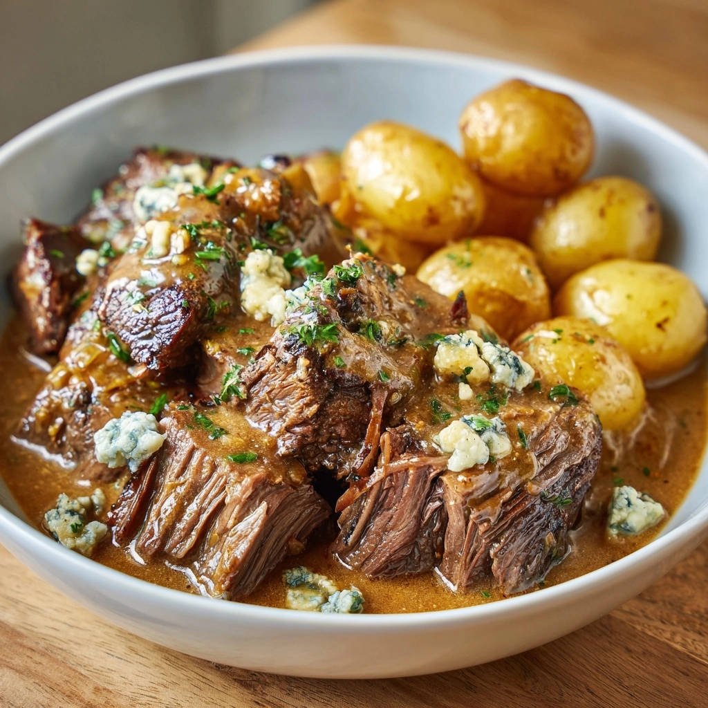 - Ladle the braised beef, potatoes, and plenty of rich sauce into bowls. Garnish with crumbled blue cheese and fresh chopped parsley before serving. Enjoy your perfectly tender, unbelievably flavorful meal!