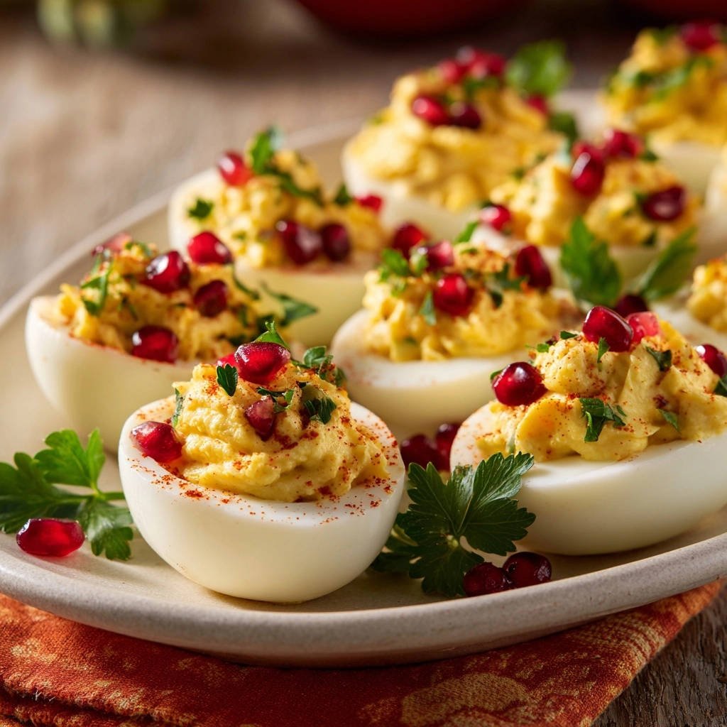 - Garnish each deviled egg with a sprinkle of paprika or cayenne pepper, a few fresh pomegranate seeds, and a sprinkle of chopped fresh parsley. Serve immediately or chill until ready to serve.