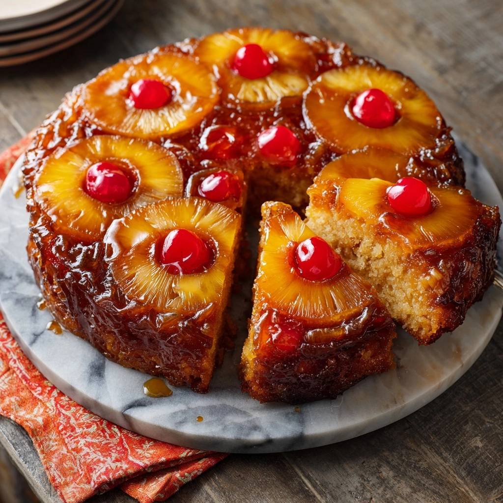 Place a large serving plate upside down over the cake pan. Using oven mitts, firmly grasp both the plate and the pan together, then quickly and confidently flip them over. Lift the cake pan slowly to reveal your perfectly inverted, gloriously intact Classic Pineapple Upside-Down Cake!