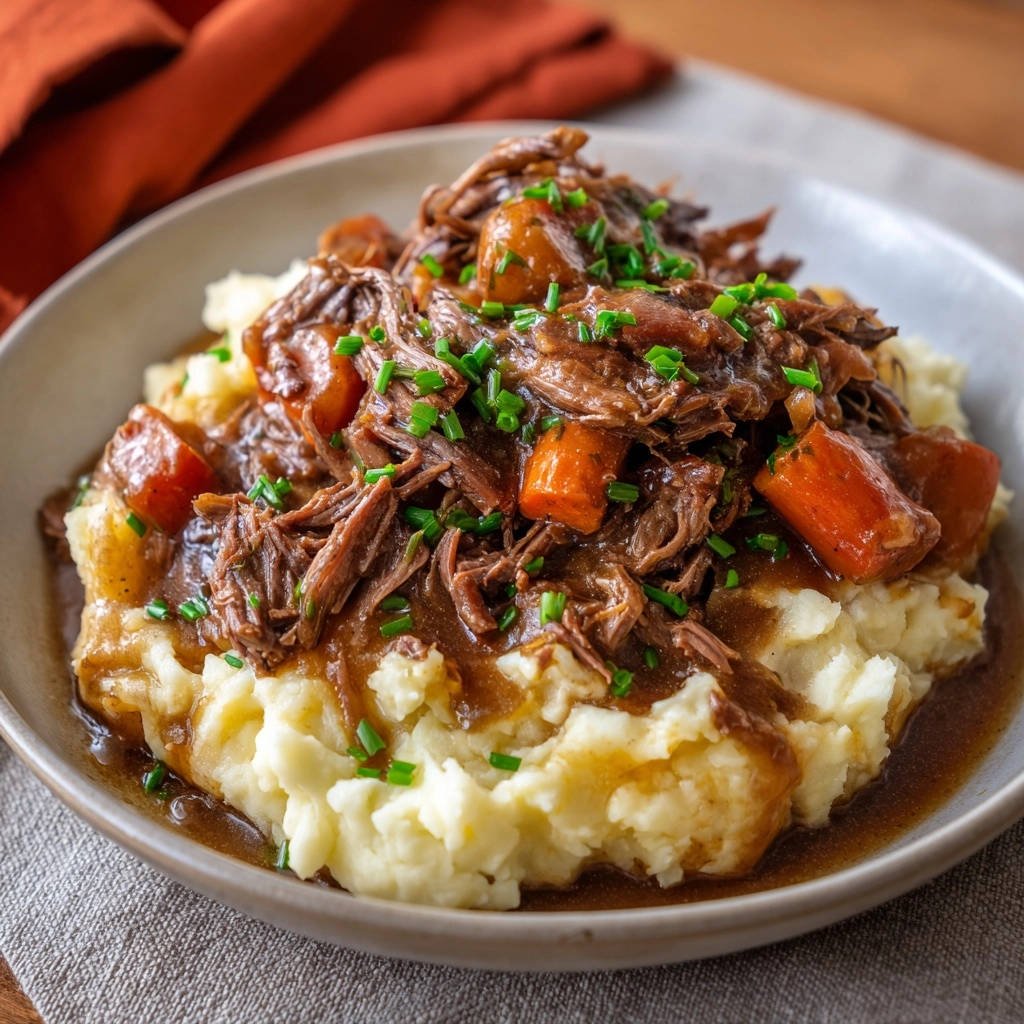- Serve the fall-apart tender pot roast and gravy generously over a bed of creamy mashed potatoes. Garnish with fresh chopped chives if desired. Enjoy your truly tender triumph!