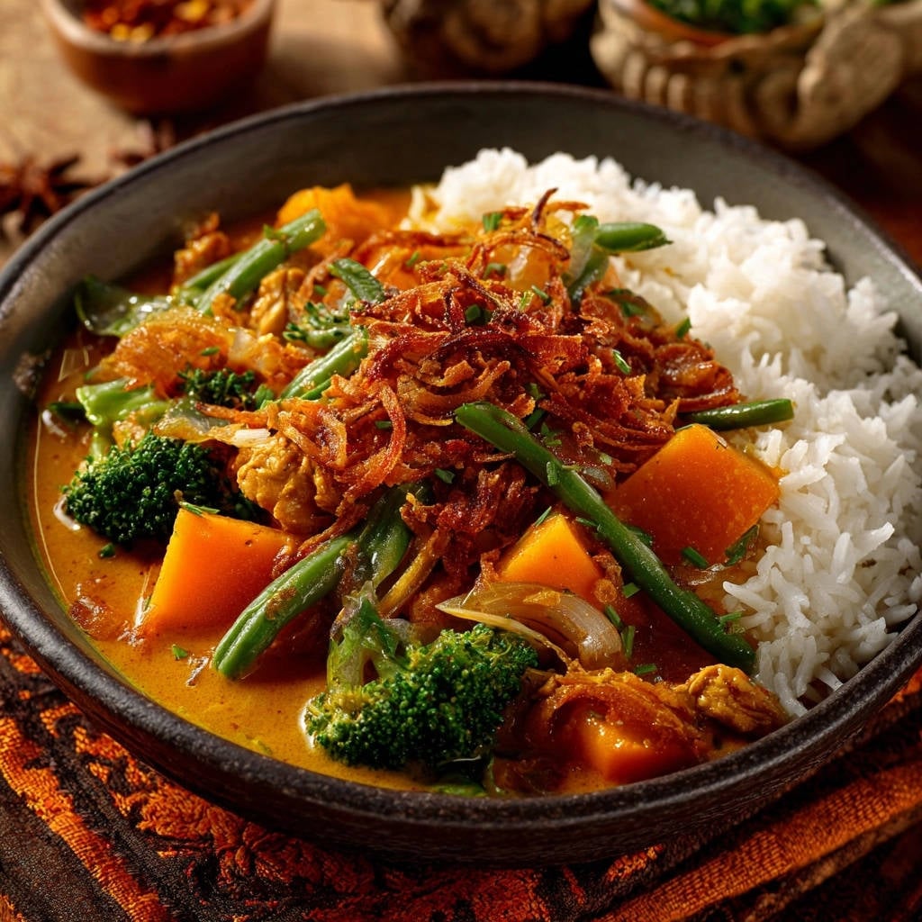 This isn’t just another curry recipe. It’s a carefully balanced dish that brings together tender proteins, sweet vegetables, and a luxurious sauce, crowned with that unforgettable crunch. It’s the kind of meal that satisfies on every level, from its comforting warmth to its vibrant flavors.