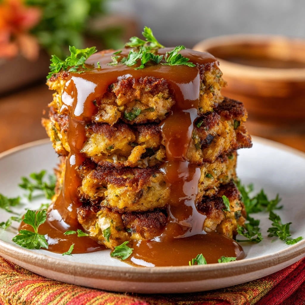 Stack your perfectly crispy potato cakes on individual plates or a serving platter. Generously drizzle with the warm, rich gravy, and garnish with additional fresh parsley for a touch of freshness and color. Enjoy your truly spectacular, non-crumbling creation, a perfect comfort food!