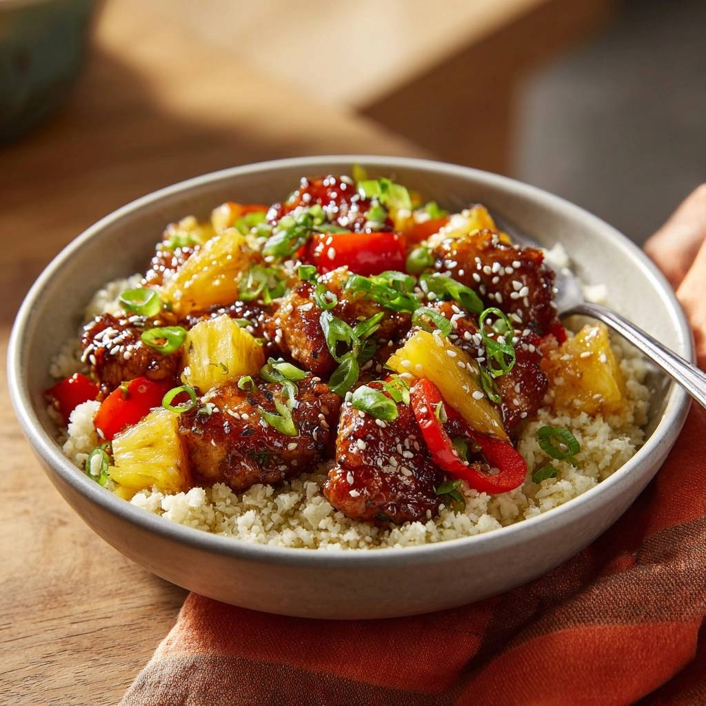 We’ve opted for a nutritious cauliflower rice base to keep these Crispy Pineapple Chicken Bowls wholesome and lighter. This choice allows the rich flavors of the chicken and sauce to truly shine.