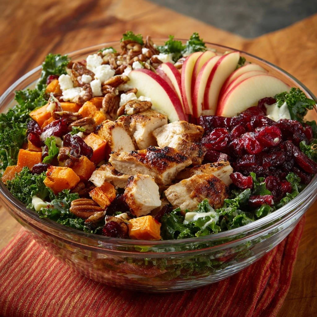- Assemble the Salad: Add the cooled roasted sweet potatoes, diced chicken, sliced apples, dried cranberries, chopped pecans, and crumbled feta cheese to the massaged kale in the large bowl. Pour the creamy apple cider vinaigrette over the salad. Toss gently but thoroughly to ensure all ingredients are well coated and combined. Serve immediately and enjoy your tender, flavorful harvest salad!