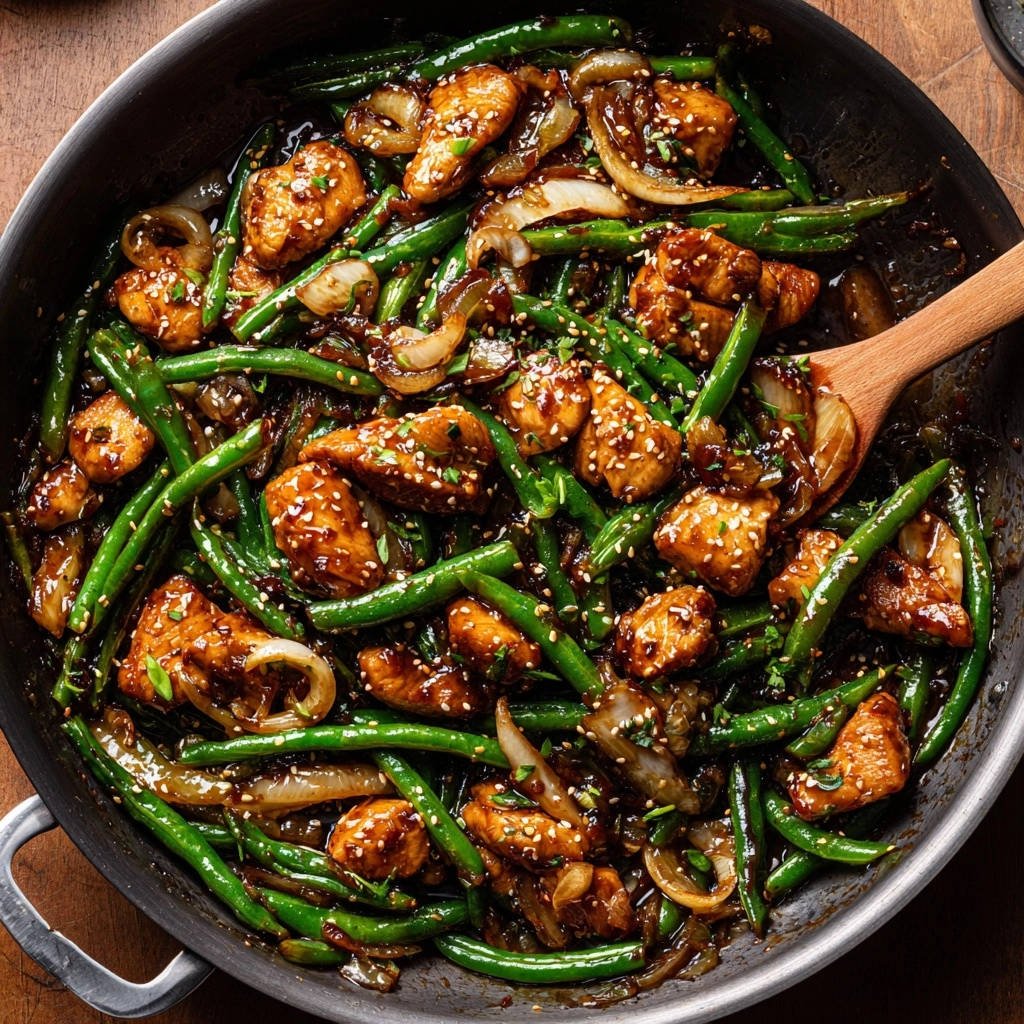 Thinly sliced yellow onion, minced garlic, and grated fresh ginger form the aromatic backbone, infusing the Skillet Chicken & Green Bean Stir Fry with irresistible fragrance and depth.
